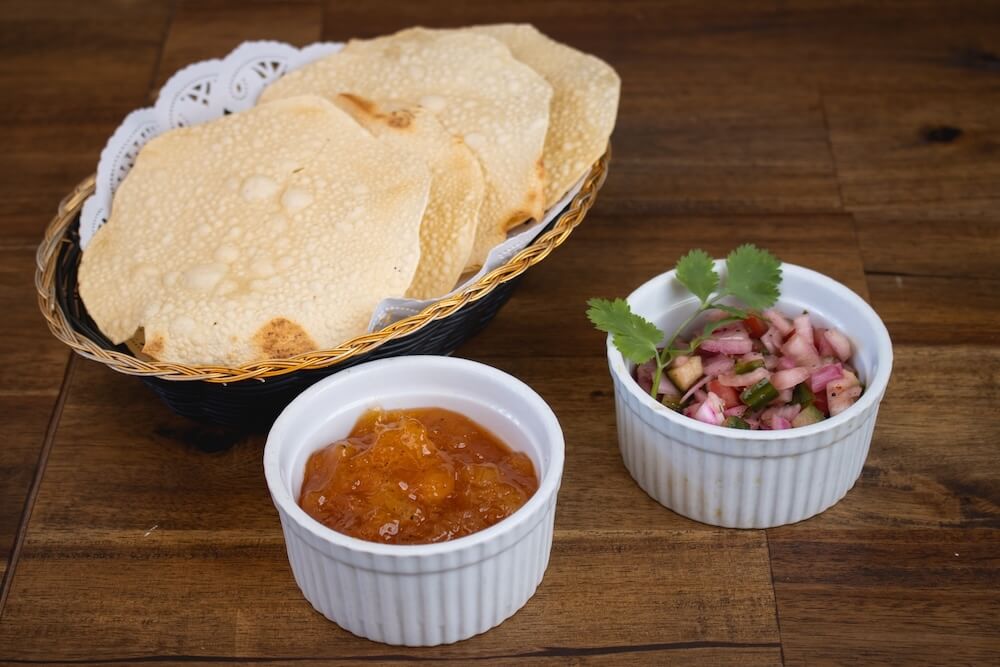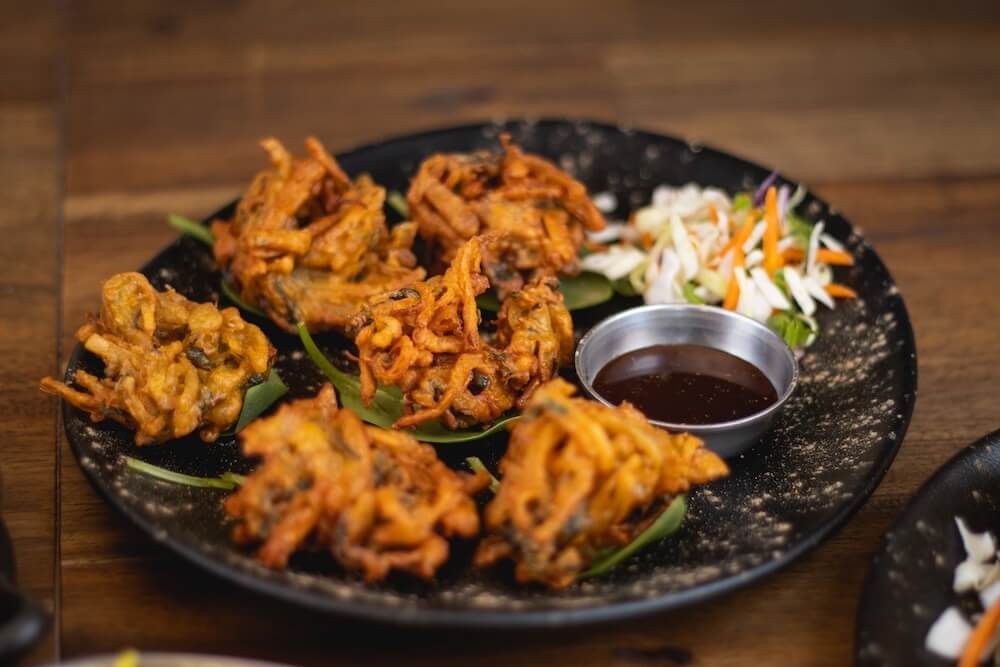 Crisp onion, potato or chicken fritters in a spiced chickpea batter, served with tamarind chutney