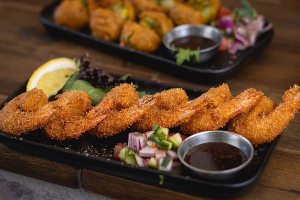 Crispy prawns in a spiced chickpea batter-coconut crust with tamarind dip.