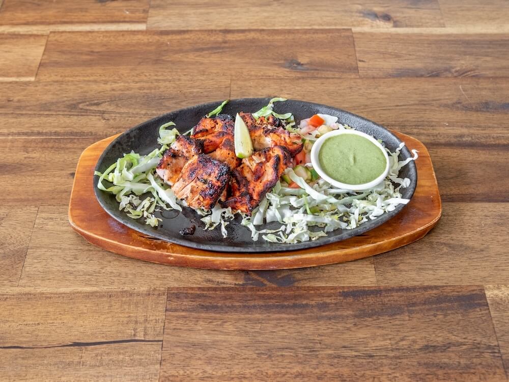 Charred tandoor roasted chicken bites in a creamy yogurt-spice marinade, served with refreshing mint chutney